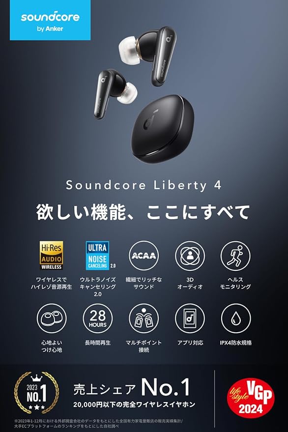 売れまくったAnkerのワイヤレスイヤホンです。ウルトラノイズキャンセリング搭載で音質もいいし、装着感も抜群。高級感もあって使い心地も良いので、これ買っておけば他のイヤホンは不要になります。カラーも豊富なので要チェック。