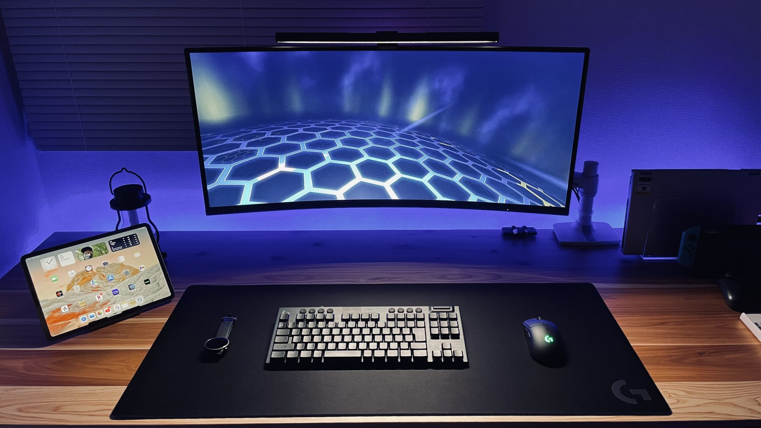 わたくし、こちらのモニターアームで、34インチのウルトラワイドモニターの湾曲ディスプレイを持ち上げています。強いッ。