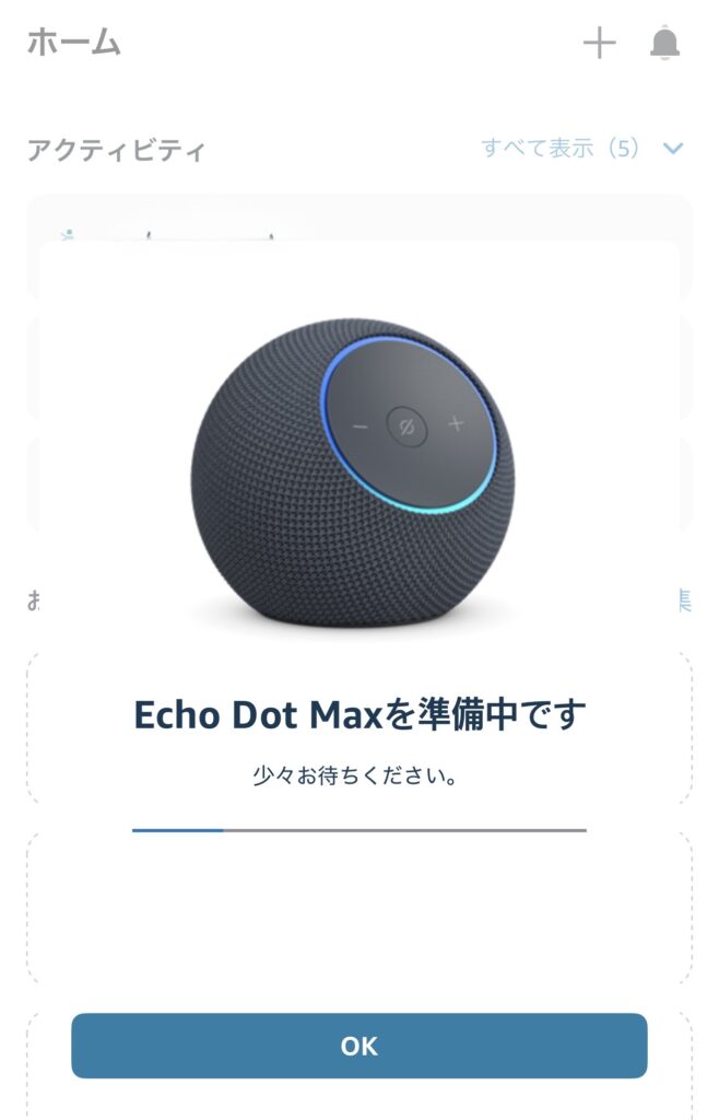 アレクサアプリを起動するだけで下記の画面が表示されて、自動で「Echo Dot Max」のセットアップが完了。こいつは楽でいいや。