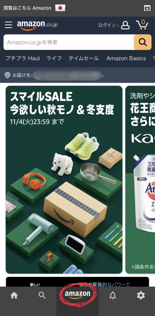 下の画像のようなトップページにアクセスするので「検索」を選択して自分が調べたい商品を入力して検索します。例では「Kindle」と入力をしています。