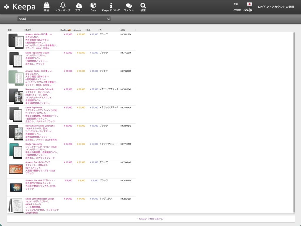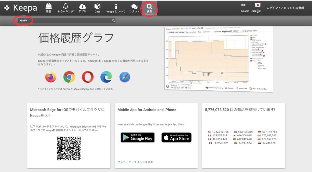 下の画像のようなトップページにアクセスするので「検索」を選択して自分が調べたい商品を入力して検索します。例では「Kindle」と入力をしています。