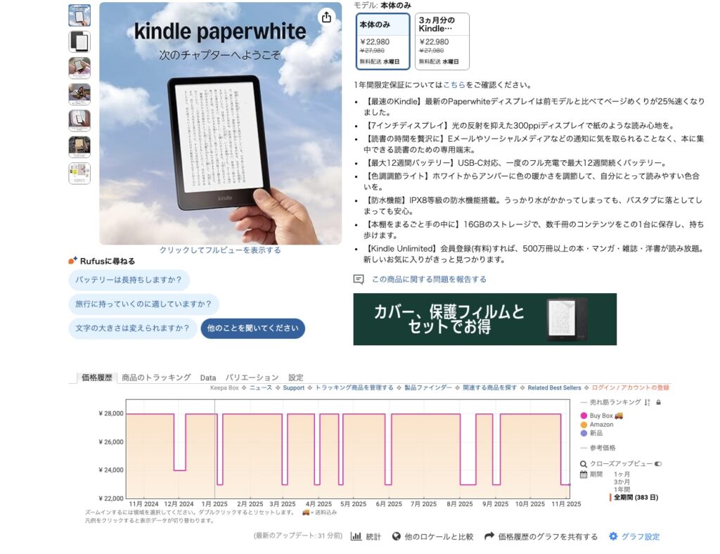 Keepaとは、Amazonの商品ページに価格変動グラフを表示し、セール前・セール中・セール後の価格動向をチェックできる専用ツールです。たとえば「この商品、昨日安かったのに今日は少し値上がっている…」といった疑問も、過去の価格推移が見えることで納得感が生まれます。