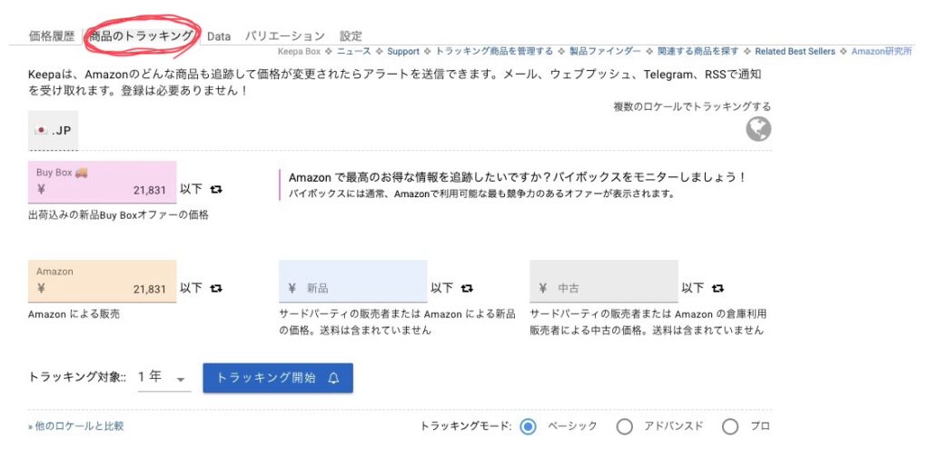 無料のアカウントを作成すると、Amazon公式サイトで表示されている価格推移グラフのタブからトラッカーに移動できます。